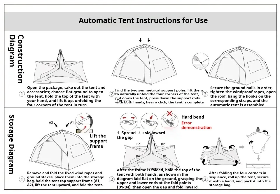 1.Remove and fold the fixed wind ropes and ground stakes, place them into the storage bag, hold the tent top support frame (A1, A2), lift the tent upward, and fold the tent.